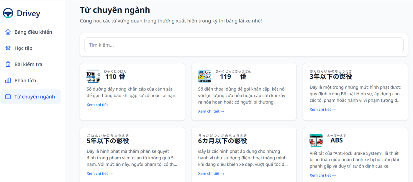 Drivey tích hợp nhiều tính năng hỗ trợ học hiệu quả như: giải thích chi tiết đáp án, hệ thống biển báo -luật giao thông, thống kê tiến độ và phân loại câu hỏi theo từng chủ đề. Nhờ đó, bạn dễ dàng nắm vững kiến thức cần thiết cho kỳ thi, tiết kiệm thời gian ôn luyện, và tự tin hơn trong quá trình chuẩn bị lấy bằng lái xe tại Nhật.Các bạn có thể tìm hiểu thêm về ứng dụng thông qua trang